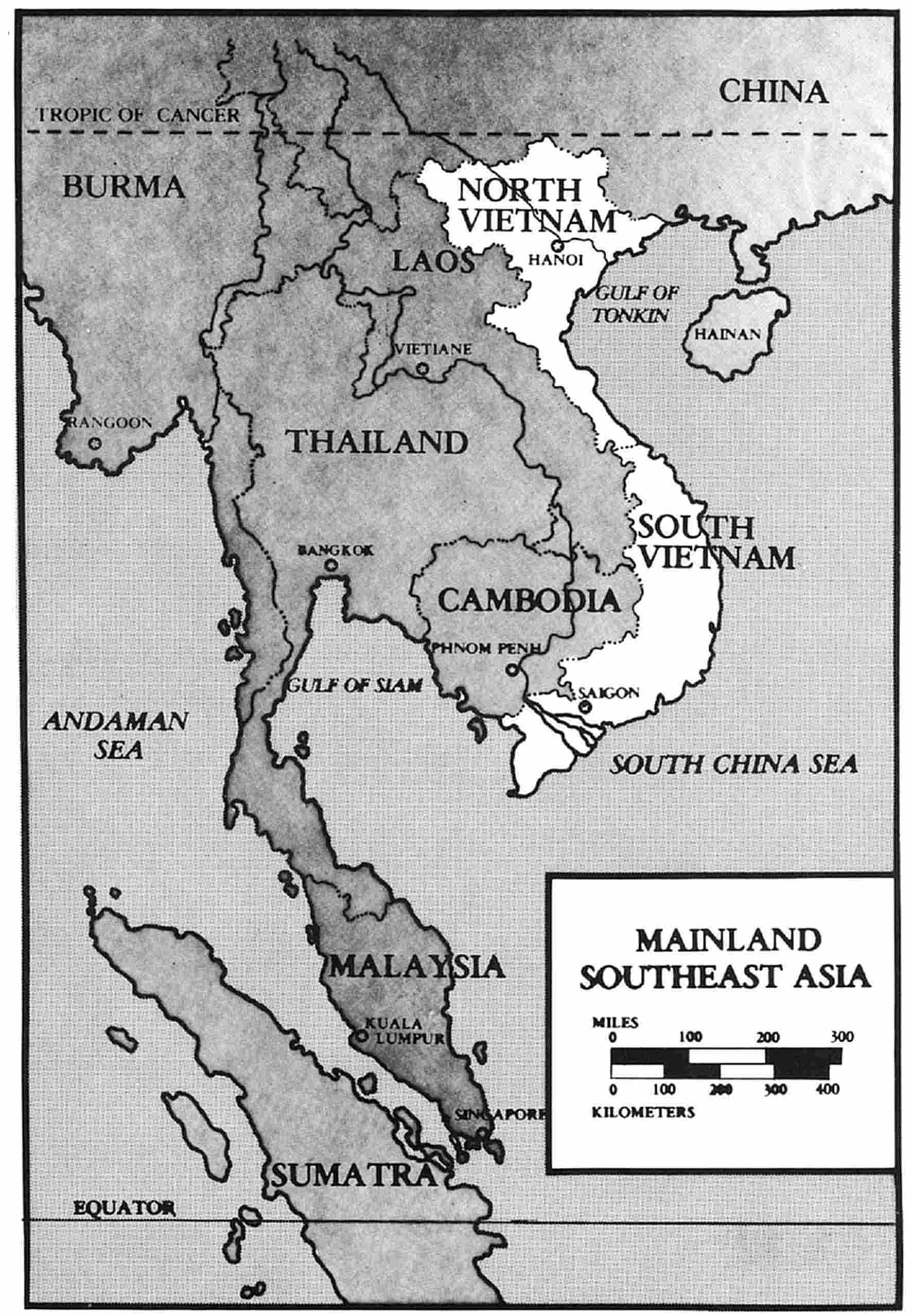 Hanging like a bulbous pendant from China’s southern border, the Southeast Asian land mass projects itself southward to within 100 miles of the equator. Often referred to as the Indochinese Peninsula, this land mass is contained by the Andaman Sea on the west, the Gulf of Siam on the south, and the South China Sea and the Tonkin Gulf on the east. Along with the extensive Indonesian island chain which lies to the immediate south, mainland Southeast Asia dominates the key water routes between the Pacific and the Indian Oceans. So positioned, the Indochinese Peninsula and the offshore islands resemble the Middle East in that they traditionally have been recognized as a “crossroads of commerce and history.”[1-1]